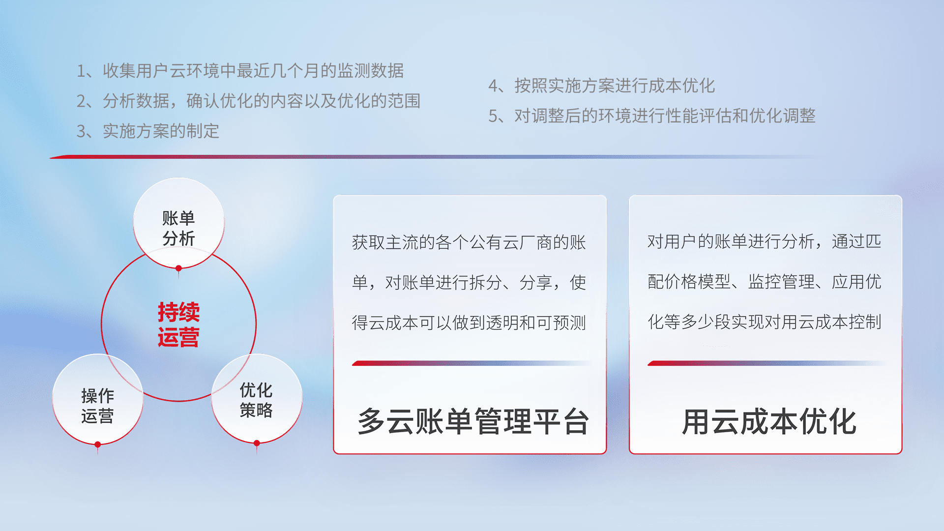 通过多云纳管,,,以统一的资源数据模型把客户的云资源进行抽象和封装,,,进而实现对多云资源的统一操作,,,,保障云资源管理的可靠性、、稳定性与可用性。。。量身定制化运维内容,,,,配置、、开发运维、、、、补丁管理、、、备份、、、监控、、、、认证和访问管理、、审计和日常巡检等,,,保障在用云过程中的可靠度,,,,稳定度以及高可用率。。